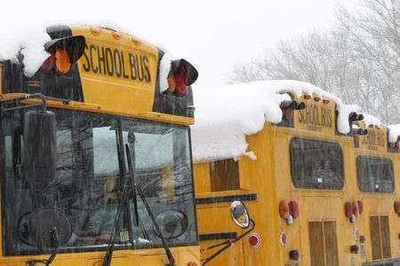 Snow falls over school buses parked at Great Falls Elementary School in Great Falls, Virginia,