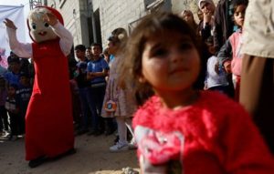FILE PHOTO: A girl looks on, as a Palestinian dressed in a costume entertains children, in Deir al-Balah, central Gaza Strip, May 15, 2023. REUTERS/Ibraheem Abu Mustafa