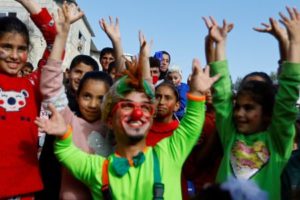 FILE PHOTO: A Palestinian dressed in a clown costume entertains children, in Deir al-Balah, central Gaza Strip, May 15, 2023. REUTERS/Ibraheem Abu Mustafa