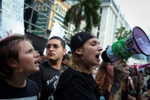 People protest outside the Four Seasons Hotel as Florida Governor Ron DeSantis is expected to publicly announce he is running for the 2024 Republican presidential nomination during a discussion on Twitter with Twitter CEO Elon Musk, after filing a document with the Federal Election Commission declaring his candidacy, in Miami, Florida, U.S., May 24, 2023. REUTERS/Marco Bello