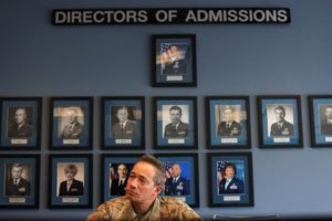 Colonel Arthur Primas Jr., the U.S. Air Force Academy’s admissions director, sits down for an interview while pictures of his predecessors hang on the wall in the background, in Colorado Springs, Colorado, U.S. April 19, 2023. REUTERS/Kevin Mohattt