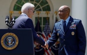 U.S. President Joe Biden congratulates U.S. Air Force General Charles Brown Jr. after announcing his nomination of Brown to serve as the next chairman of the U.S. Joint Chiefs of Staff, during an event in the Rose Garden at the White House in Washington, U.S., May 25, 2023. REUTERS/Evelyn Hockstein