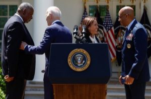 U.S. President Joe Biden talks with U.S. Defense Secretary Lloyd Austin as Vice President Kamala Harris talks with U.S. Air Force General Charles Brown, Jr., after Biden nominated Brown to serve as the next chairman of the U.S. Joint Chiefs of Staff, during an event in the Rose Garden at the White House in Washington, U.S., May 25, 2023. REUTERS/Evelyn Hockstein