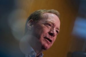 President of Microsoft Brad Smith reacts during an interview with Reuters at the Web Summit, Europe’s largest technology conference, in Lisbon, Portugal, November 3, 2021. REUTERS/Pedro Nunes