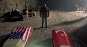 Founder of Wagner private mercenary group Yevgeny Prigozhin stands next to coffins covered with flags of U.S. and Turkey, in the course of Russia-Ukraine conflict in an unidentified location, in this still image taken from video released May 25, 2023. Press service of “Concord”/Handout via REUTERS