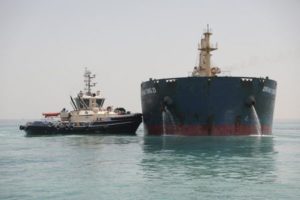 A general view of tugboat working to refloat the cargo ship XIN HAI TONG 23 to the waiting area, in the canal next to Ismailia, Egypt May 25, 2023. The Suez Canal Authority/Handout via REUTERS