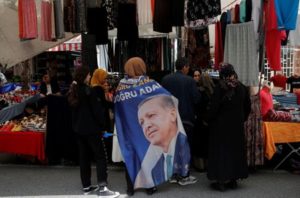 FILE PHOTO: A woman carrying an election campaign flag of Turkish President Tayyip Erdogan on her shoulders, shops at a local market, ahead of the May 28 presidential runoff vote, in Istanbul, Turkey May 24, 2023. REUTERS/Dilara Senkaya