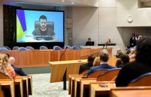FILE PHOTO: Ukrainian President Volodymyr Zelenskiy appears on screen as he addresses the members of Dutch parliament via video link, amid Russia’s invasion of Ukraine, in The Hague, Netherlands, March 31, 2022. REUTERS/Piroschka Van De Wouw
