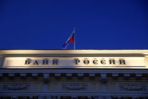 FILE PHOTO: A Russian state flag flies over the Central Bank headquarters in Moscow, Russia March 29, 2021. A sign reads: “Bank of Russia”. REUTERS/Maxim Shemetov