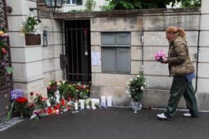 People lay flowers and candles in front of the home
