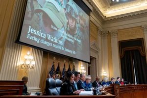 An image of Jessica Watkins, who is facing charges related to Jan. 6, is displayed along with her audio during a public hearing of the U.S. House Select Committee to investigate the January 6 Attack on the U.S. Capitol, on Capitol Hill in Washington, U.S., October 13, 2022. Andrew Harnik/Pool via REUTERS/File Photo