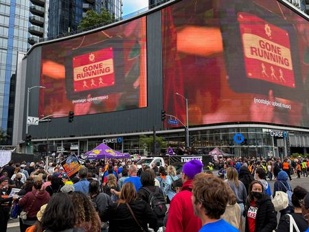 LOS ANGELES (Reuters) – Unions representing teachers, truck drivers and other workers who will be headed soon to the bargaining table turned out in downtown Los Angeles on Friday to support Hollywood’s striking film and television writers.