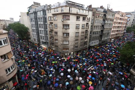 BELGRADE (Reuters) – Tens of thousands braved rain and wind in Belgrade on Saturday in an anti-government protest over two mass shootings that killed 18 people, blaming the deaths on a culture of violence that critics say authorities have allowed to permeate society.