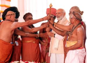 India’s Prime Minister Narendra Modi holds a sengol with Hindu priests during the inauguration of new Parliament building in New Delhi, India, May 28, 2023. India’s Press Information Bureau/Handout via REUTERS