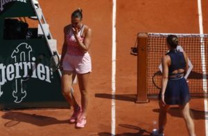 Tennis – French Open – Roland Garros, Paris, France – May 28, 2023 Belarus’ Aryna Sabalenka and Ukraine’s Marta Kostyuk during a break in play on their first round match REUTERS/Kai Pfaffenbach