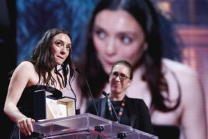 FILE PHOTO: Merve Dizdar, Best Actress award winner for her role in the film “Kuru Otlar Ustune” (About Dry Grasses – Les herbes seches), delivers a speech during the closing ceremony of the 76th Cannes Film Festival in Cannes, France, May 27, 2023. REUTERS/Gonzalo Fuentes