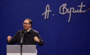 FILE PHOTO: Serbia’s President Aleksandar Vucic addresses his supporters during a rally in front of the Parliament building in Belgrade, Serbia, May 26, 2023. REUTERS/Marko Djurica