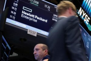FILE PHOTO: A trader passes by the post where Hewlett Packard Enterprise Co., is traded on the floor of the New York Stock Exchange (NYSE) in New York City, U.S., May 25, 2016. REUTERS/Brendan McDermid