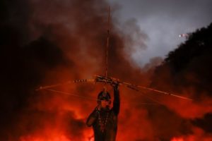 A member of Guarani Mbya Indigenous people uses a bow and arrow during a protest against the so-called legal thesis of “Marco Temporal” (Temporal Milestone) as they close the Bandeirantes highway in Sao Paulo, Brazil May 30, 2023. REUTERS/Amanda Perobelli