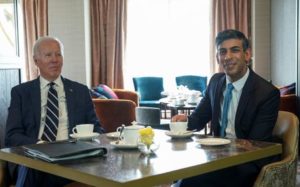 FILE PHOTO: U.S. President Joe Biden meets British Prime Minister Rishi Sunak at the Grand Central Hotel, Belfast, Northern Ireland April 12, 2023. REUTERS/Kevin Lamarque