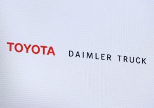 Logos of Toyota Motor Corp and Daimler Truck are pictured at their joint news conference in Tokyo, Japan, May 30, 2023. REUTERS/Kim Kyung-Hoon