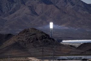 FILE PHOTO: A solar power tower is seen amidst power lines and transmission towers at the Ivanpah Solar Electric Generating System, in the Mojave Desert near Nipton, California U.S., February 27, 2022. REUTERS/Bing Guan