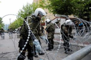 Polish members of the NATO-led Kosovo Force (KFOR) set up a wire fencing as they stand guard near a municipal office in Zvecan, Kosovo, May 31, 2023. REUTERS/Ognen Teofilovski