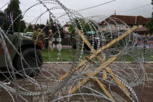 U.S. Kosovo Force (KFOR) soldiers, under NATO, stand guard near a municipal office in Leposavic, Kosovo May 31, 2023. REUTERS/Fatos Bytyci