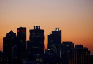 FILE PHOTO: The buildings with the logos of three of South Africa’s biggest banks, ABSA, Standard Bank and First National Bank (FNB) are seen against the city skyline in Cape Town, South Africa, September 3, 2017. REUTERS/Mike Hutchings