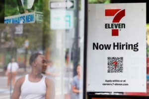 FILE PHOTO: A 7-Eleven convenience store has a sign in the window reading “Now Hiring” in Cambridge, Massachusetts, U.S., July 8, 2022. REUTERS/Brian Snyder