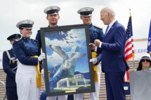 U.S. President Joe Biden receives a gift during the graduation ceremony at the Air Force Academy in Colorado Springs, Colorado, U.S. June 1, 2023. REUTERS/Kevin Lamarque