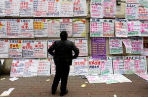 FILE PHOTO: A man looks at job information at an employment fair beside a street in Zhengzhou, Henan province, February 19, 2014. REUTERS/Jason Lee