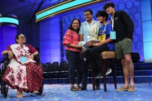 Dev Shah, 14, holds the trophy accompanied by his father Deval Shah, his mother Nilam Shah, his brother Neil Shah and his grandmother Vinaben Shah after winning the Scripps National Spelling Bee competition in National Harbor, Maryland U.S., June 1, 2023. REUTERS/Leah Millis