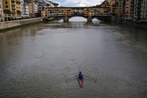 FILE PHOTO: A man rows his canoe on the Arno river in front of Ponte Vecchio (Old Bridge) in Florence, Italy December 11, 2021. REUTERS/Nacho Doce