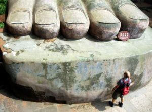 FILE PHOTO: A visitor looks at the foot of the Leshan Giant Buddha statue in Leshan in southwest China’s Sichuan province August 29, 2005.