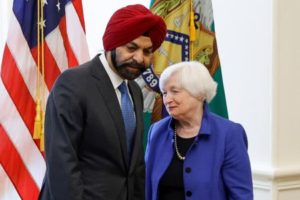 U.S. Treasury Secretary Janet Yellen welcomes incoming World Bank President Ajay Banga at the Treasury Department in Washington, U.S. June 1, 2023. REUTERS/Jonathan Ernst