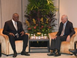 Singapore’s Minister for Defence Dr Ng Eng Hen meets with U.S. Defense Secretary Lloyd Austin on the sidelines of the 20th Shangri-La Dialogue in Singapore June 2, 2023. Singapore Ministry of Defence/Handout via REUTERS