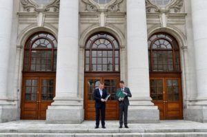 FILE PHOTO: Ireland’s Minister for Finance Michael McGrath and Minister for Public Expenditure and Reform Paschal Donohoe in the courtyard of Government Buildings, Dublin, Ireland, October 12, 2021. REUTERS/Clodagh Kilcoyne