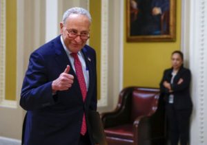 U.S. Senate Majority Leader Chuck Schumer (D-NY) gives a thumbs up after passing bipartisan legislation that lifts the debt ceiling, averting what would have been a first-ever default, on Capitol Hill in Washington, U.S., June 1, 2023. REUTERS/Evelyn Hockstein
