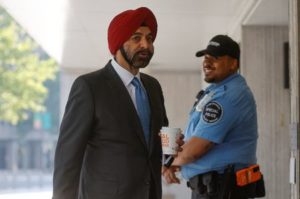 World Bank President Ajay Banga greets security guards as he arrives for his first day of work at World Bank headquarters in Washington, U.S. June 2, 2023. REUTERS/Jonathan Ernst