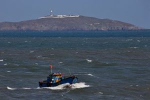 A Chinese fishing boat sails across the Taiwan Strait near