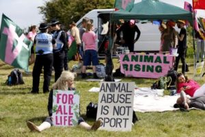 Horse Racing – Epsom Derby Festival – Epsom Downs Racecourse, Epsom, Britain – June 3, 2023 Animal Rising activists display signs to protest before the start of the Epsom Derby Festival Action Images via Reuters/Peter Cziborra