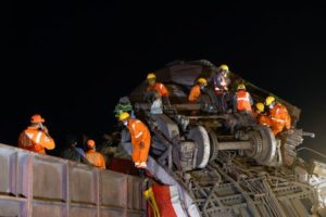 Rescue workers search for survivors at the site of a train collision after the accident in Balasore district in the eastern state of Odisha, India, June 3, 2023. REUTERS/Adnan Abidi