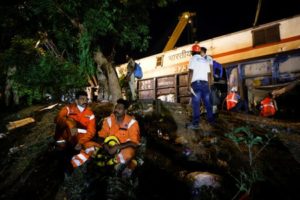 Rescue workers sit as heavy machinery operates at the site of a train collision after the accident in Balasore district in the eastern state of Odisha, India, June 3, 2023. REUTERS/Adnan Abidi