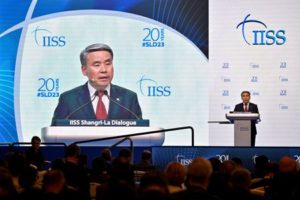 South Korea’s Minister of National Defence, Lee Jong-sup speaks at a plenary session of the 20th IISS Shangri-La Dialogue in Singapore June 3, 2023. REUTERS/Caroline Chia