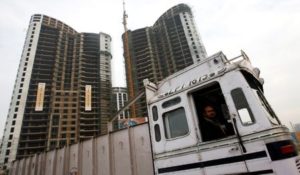 FILE PHOTO: A truck driver looks out at the construction site of a residential apartment building by Indian property developer DLF Ltd. in Gurgaon January 27, 2010. REUTERS/Adnan Abidi