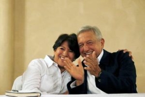 FILE PHOTO: Delfina Gomez of the National Regeneration Movement (MORENA), candidate for the governor of the State of Mexico, smiles next to Andres Manuel Lopez Obrador, leader of MORENA during a news conference in Mexico City, Mexico June 6, 2017. REUTERS/Carlos Jasso
