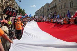 People carry a giant Polish flag during a march on the 34th anniversary of the first democratic elections in postwar Poland, in Warsaw, Poland, June 4, 2023. REUTERS/Kacper Pempel