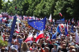 People carry Polish and European Union flags as they take part in a march on the 34th anniversary of the first democratic elections in postwar Poland, in Warsaw, Poland, June 4, 2023. REUTERS/Kacper Pempel