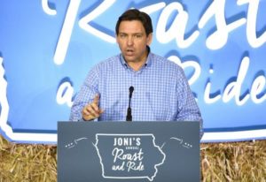 U.S. Republican presidential candidate and Florida Governor Ron DeSantis speaks at the “Roast and Ride” event hosted by U.S. Senator Joni Ernst while campaigning in Des Moines, Iowa, U.S. June 3, 2023. REUTERS/Dave Kaup
